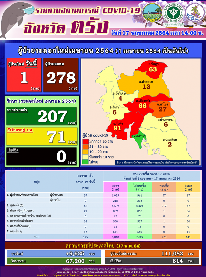 เมื่อวันที่ 17 พ.ค. 2564 นพ.ตุลกานต์ มักคุ้น โฆษกศูนย์บริหารสถานการณ์การแพร่ระบาดของโรคติดเชื้อไวรัสโคโรนา 2019 จังหวัดตรัง และพญ.ทิพย์ลดา บุญชัย รองโฆษกศูนย์บริหารสถานการณ์การแพร่ระบาดของโรคติดเชื้อไวรัสโคโรนา 2019 จังหวัดตรัง ร่วมแถลงข่าวว่า วันนี้พบผู้ติดเชื้อโควิด-19 รายใหม่เพิ่ม 1 ราย เท่ากับเมื่อวาน รวมมียอดผู้ป่วยติดเชื้อสะสมในการระบาดรอบเดือน เม.ย. 2564 จำนวน 278 ราย
