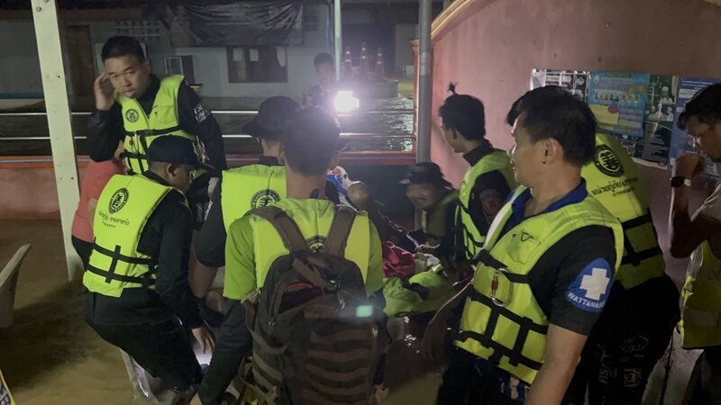 เจ้าหน้าที่กู้ภัยฯไปถึงพบว่าระดับน้ำเหลือเพียงแค่นิดเดียวก็จะถึงเตียงของผู้ป่วยแล้ว จึงได้นำตัวใส่เปลออกมา พร้อมกับนำภรรยา ซึ่งเป็นไปอย่างทุลักทุเล เนื่องจากระยะทางที่ไปกลับประมาณ 2 กิโลเมตร ก่อนจะทำการนำตัวฝ่ากระแสน้ำออกมาได้ หลังจากนำตัวออกมาปรากฏว่าผู้ป่วยมีอาการซึมลง ทางมูลนิธิฯ จึงประสานไปยังศูนย์นเรนทรตรัง สั่งการให้นำรถกู้ชีพฉุกเฉินของ รพ.ย่านตาขาว มารับช่วงต่อบริเวณถนน และเร่งนำตัวเข้ารักษา
