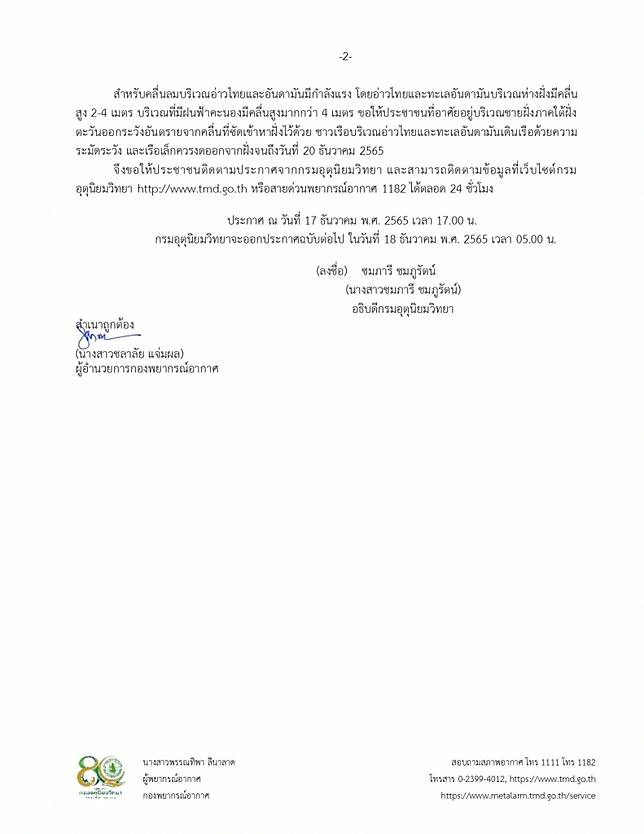 สำหรับคลื่นลมบริเวณอ่าวไทยและอันดามันมีกำลังแรง โดยอ่าวไทยและทะเลอันดามันบริเวณห่างฝั่งมีคลื่นสูง 2-4 เมตร บริเวณที่มีฝนฟ้าคะนองมีคลื่นสูงมากกว่า 4 เมตร ขอให้ประชาชนที่อาศัยอยู่บริเวณชายฝั่งภาคใต้ฝั่งตะวันออกระวังอันตรายจากคลื่นที่ซัดเข้าหาฝั่งไว้ด้วย ชาวเรือบริเวณอ่าวไทยและทะเลอันดามันเดินเรือด้วยความระมัดระวัง และเรือเล็กควรงดออกจากฝั่งจนถึงวันที่ 20 ธันวาคม 2565