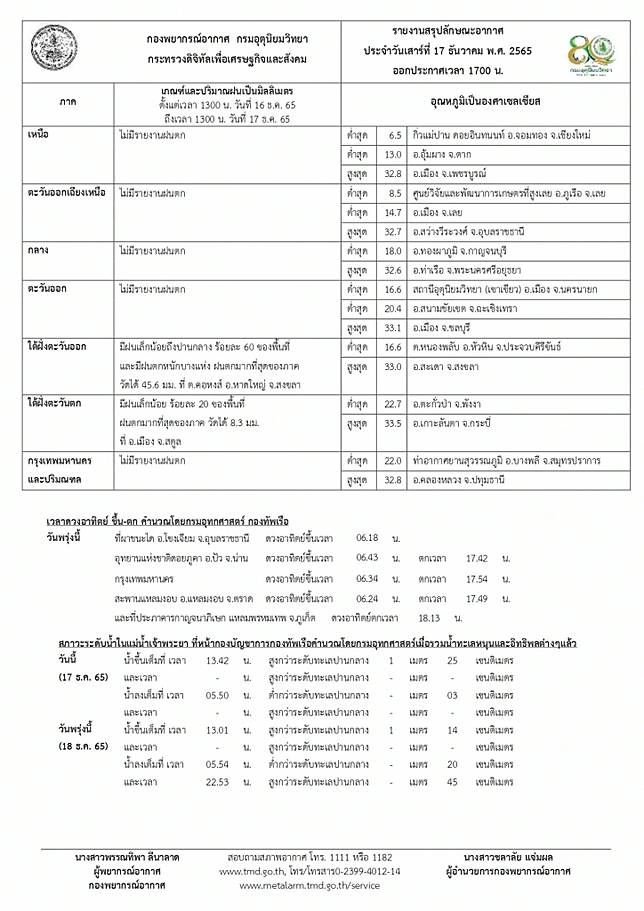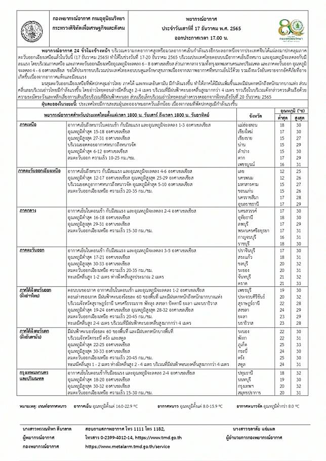 “พยากรณ์อากาศ” กรมอุตุนิยมวิทยาประกาศ เรื่อง อากาศหนาวเย็นบริเวณประเทศไทยตอนบนและคลื่นลมแรงบริเวณอ่าวไทยฉบับที่ 7 (มีผลกระทบตั้งแต่วันที่ 17 – 20 ธันวาคม 2565)ในช่วงวันที่ 17-20 ธันวาคม 2565 บริเวณความกดอากาศสูงหรือมวลอากาศเย็นกำลังแรงจากประเทศจีนได้แผ่เสริมลงมาปกคลุมประเทศไทยตอนบนแล้ว