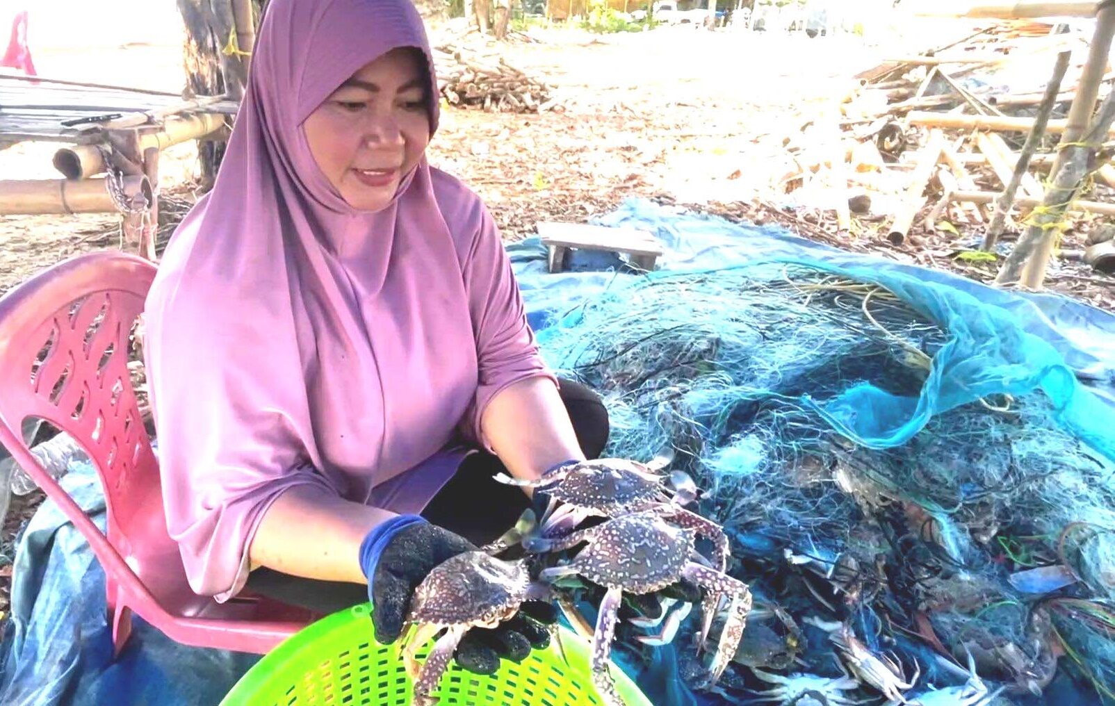 ส่งผลให้บรรยากาศ ภายในหมู่บ้าน ตลอดจนท่าเรือซอยผู้ใหญ่บ้านเก่า หนาแน่นไปด้วยครอบครัวชาวประมง ทั้ง ผู้หญิง เด็ก และผู้เฒ่าผู้แก่ ที่มาช่วยกันปลดปูออกจากอวนที่คนในครอบครัวออกไปจับปูมาได้ ซึ่งก็เหมือนกันคือ ทุกครัวเรือนสามัคคีจับมือกัน 3 ราย ในการออกเรือ 1 ลำ ออกไปวางอวนดักปูม้า เพื่อประหยัดน้ำมัน