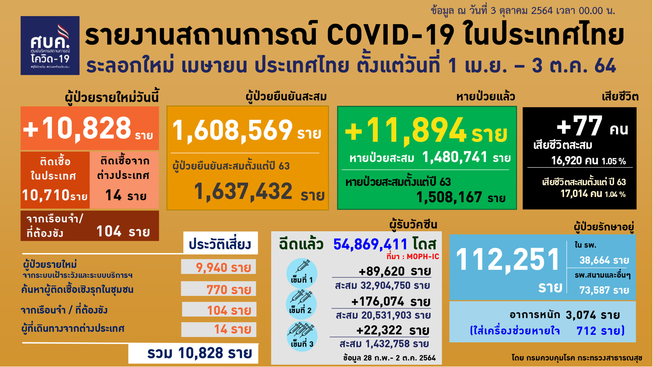 วันที่ 3 ตุลาคม 2564 ศูนย์บริหารสถานการณ์โควิด-19 (ศบค.) รายงานสถานการณ์การติดเชื้อ COVID-19 ในประเทศว่า ข้อมูลตั้งแต่วันที่ 1 เมษายน 2564 พบผู้ป่วยรายใหม่มีผู้ติดเชื้อรายใหม่ รวม 10,828 รายจำแนกเป็นผู้ป่วยจากระบบเฝ้าระวังฯ 9,940 ราย ผู้ป่วยจากการค้นหาเชิงรุก 770 ราย ผู้ป่วยภายในเรือนจำ/ที่ต้องขัง 104 ราย ผู้ป่วยมาจากต่างประเทศ 14 ราย ผู้ป่วยสะสม 1,608,569 ราย (ตั้งแต่ 1 เมษายน) ผู้ป่วยกำลังรักษา 112,251 ราย หายป่วยกลับบ้าน 11,894 ราย หายป่วยสะสม 1,204,428 ราย (ตั้งแต่ 1 เมษายน) เสียชีวิต 77 ราย