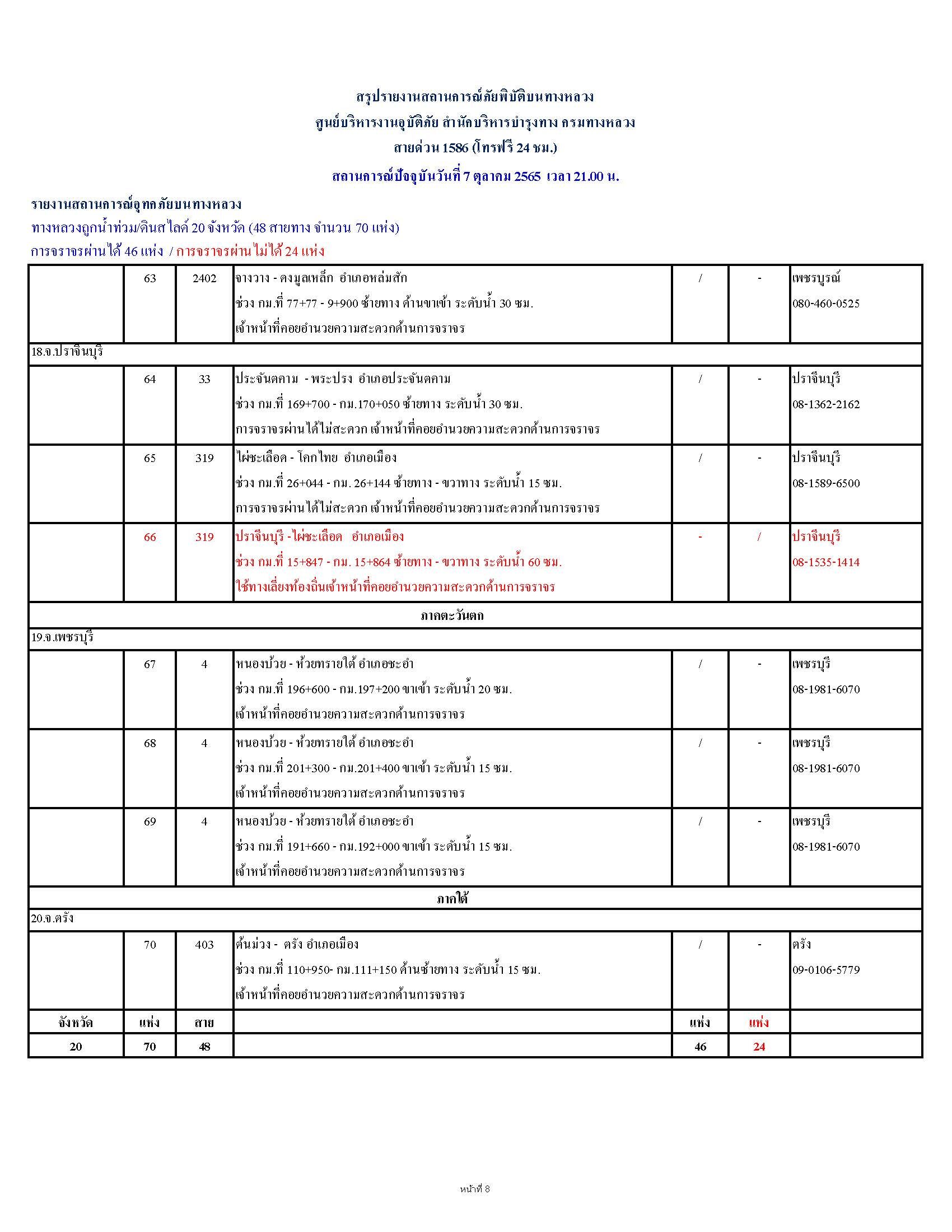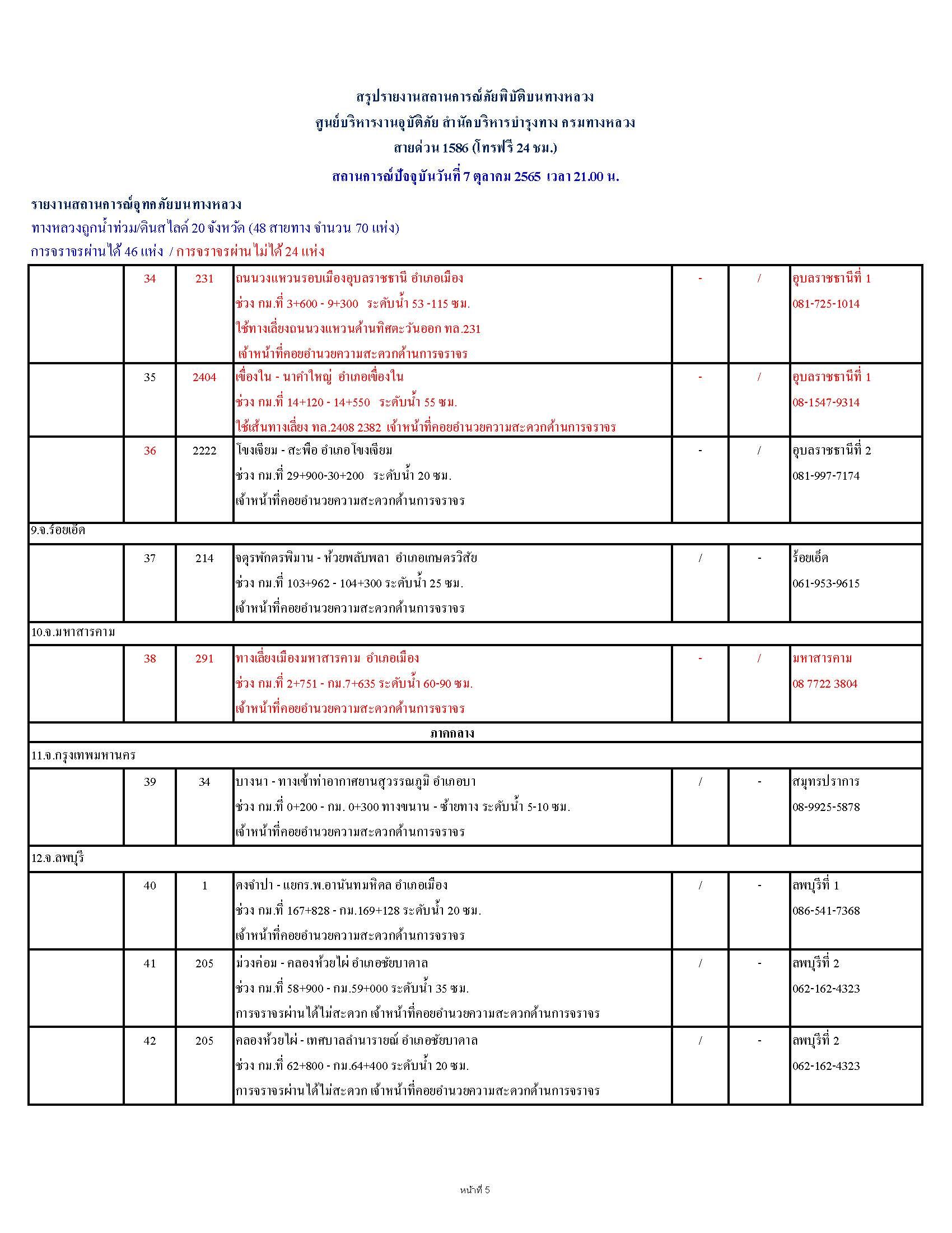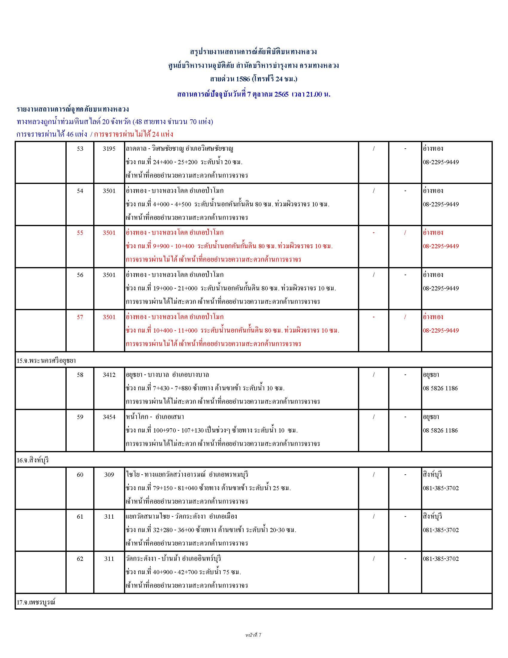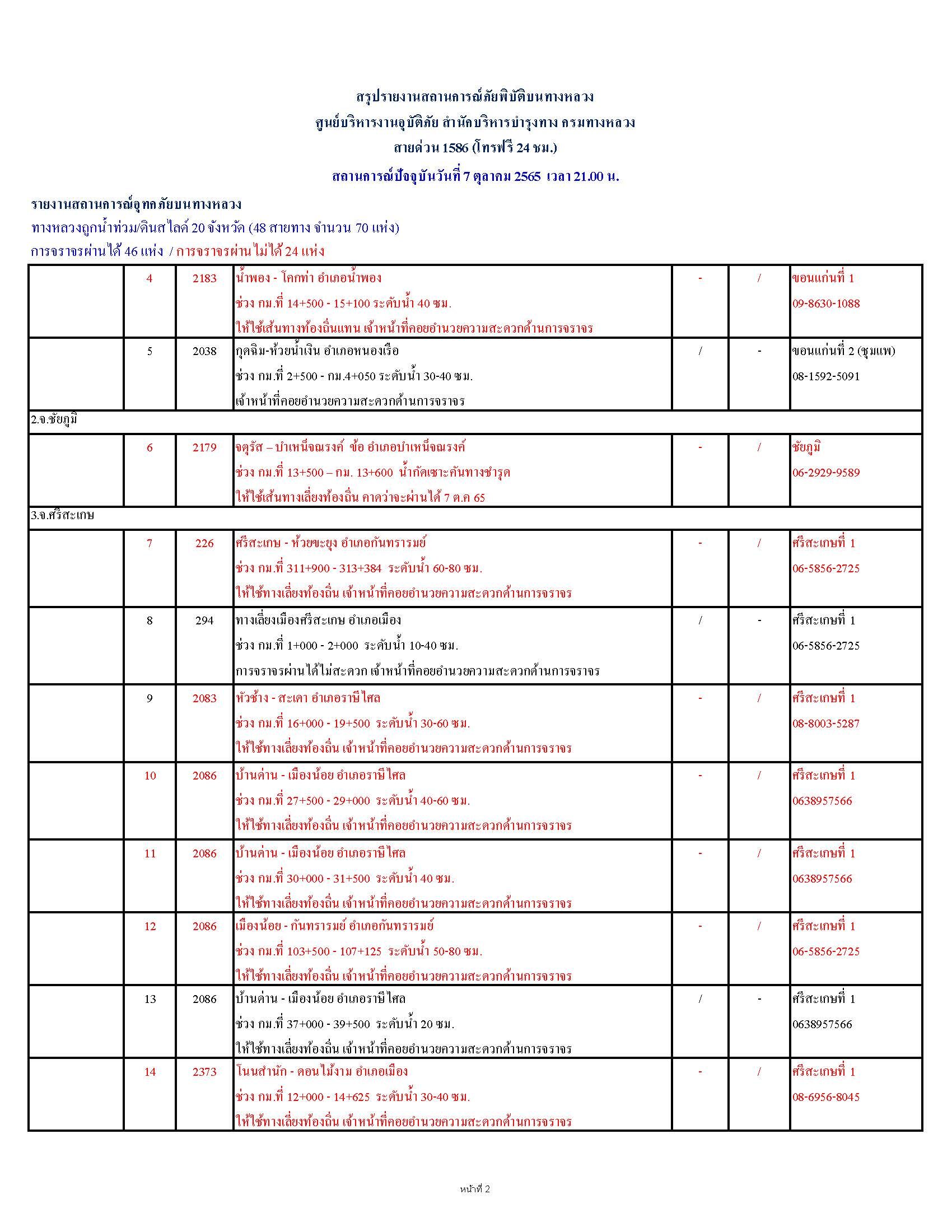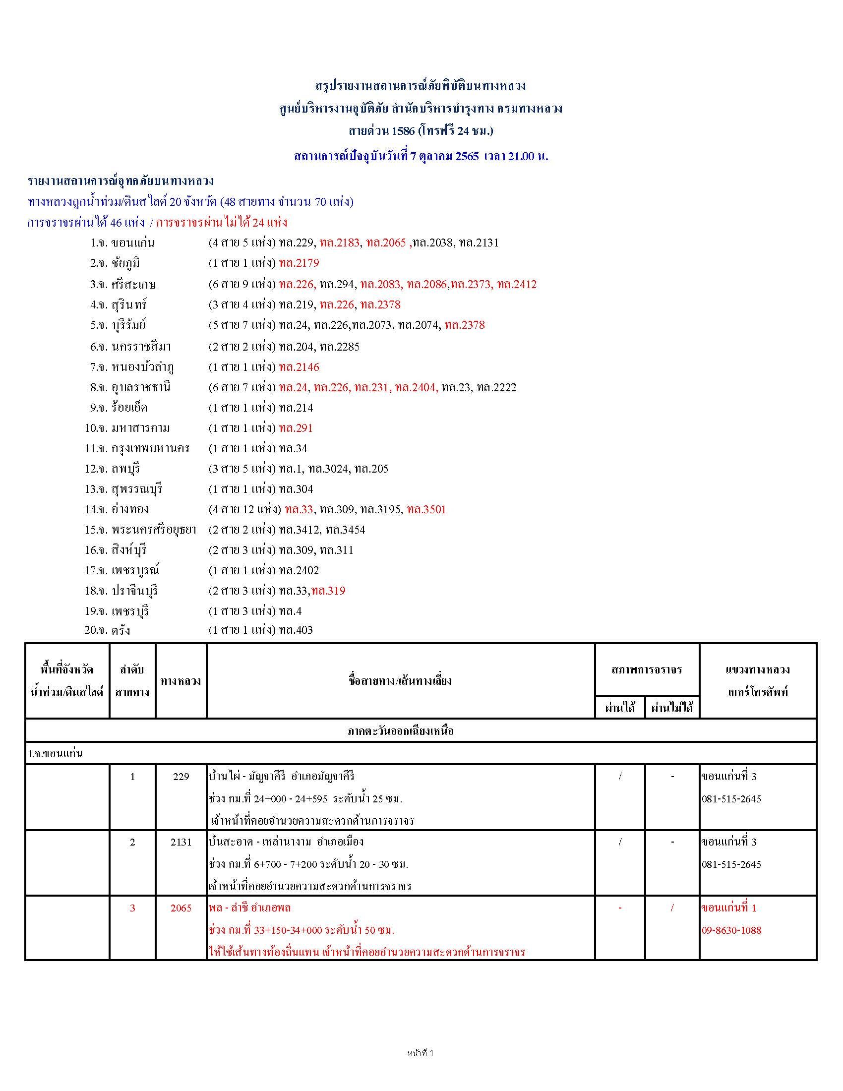 กรมทางหลวงขอรายงานสถานการณ์ น้ำท่วม และดินสไลด์ ในโครงข่ายทางหลวง วันศุกร์ที่ 7 ตุลาคม 2565 เวลา 21.00 น. ดังนี้ น้ำท่วม/ดินสไลด์ 20 จังหวัด รวม 70 แห่ง การจราจรผ่านได้ 46 แห่ง ผ่านไม่ได้ 24 แห่ง