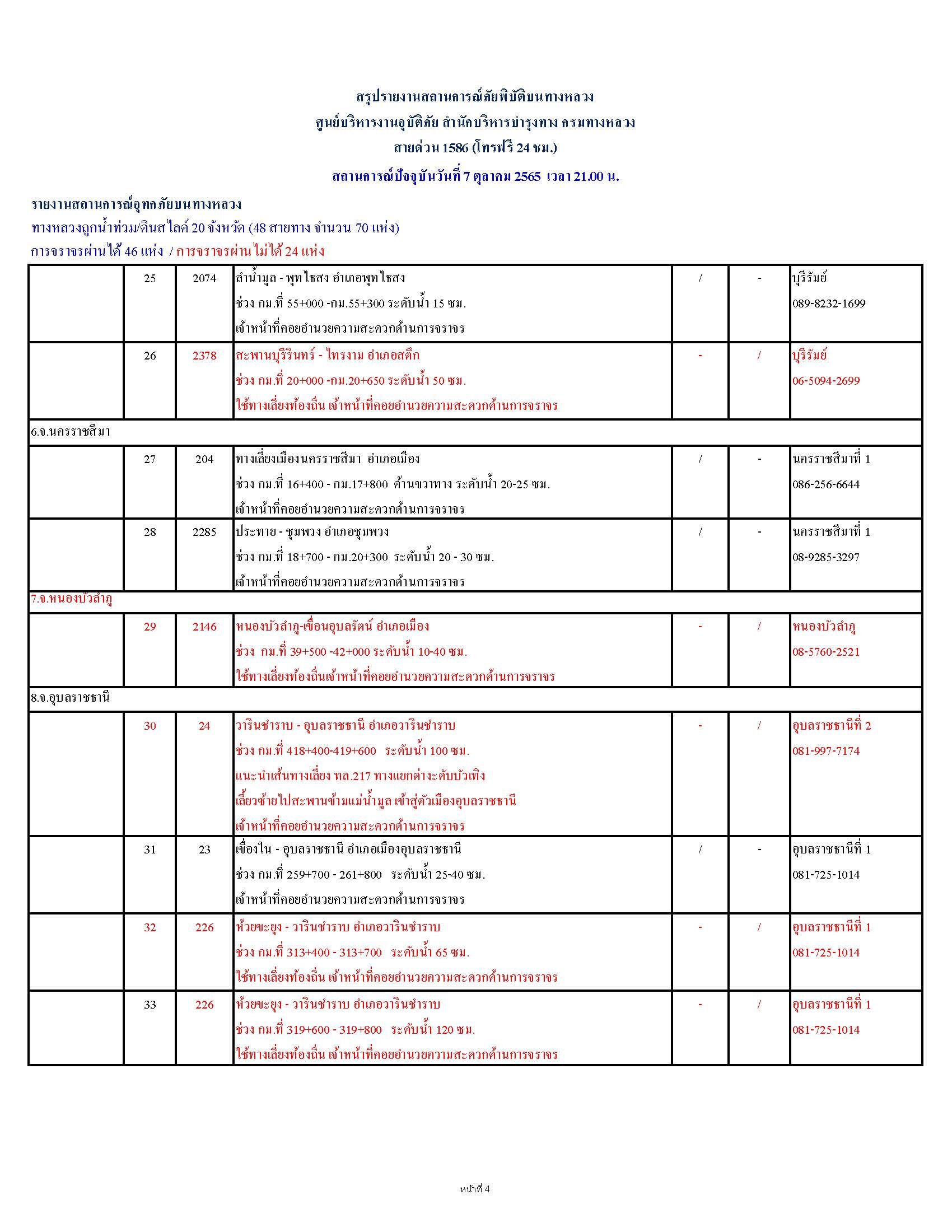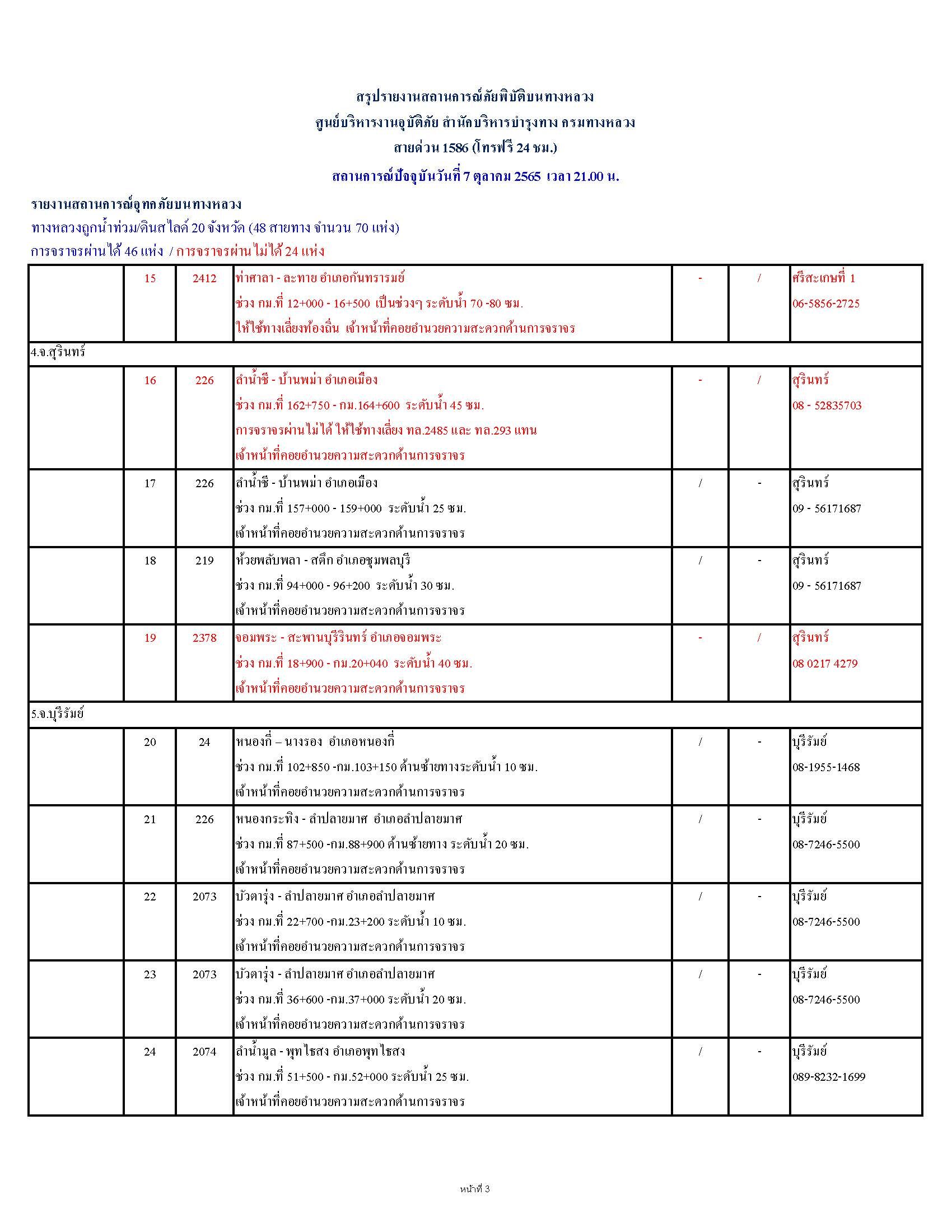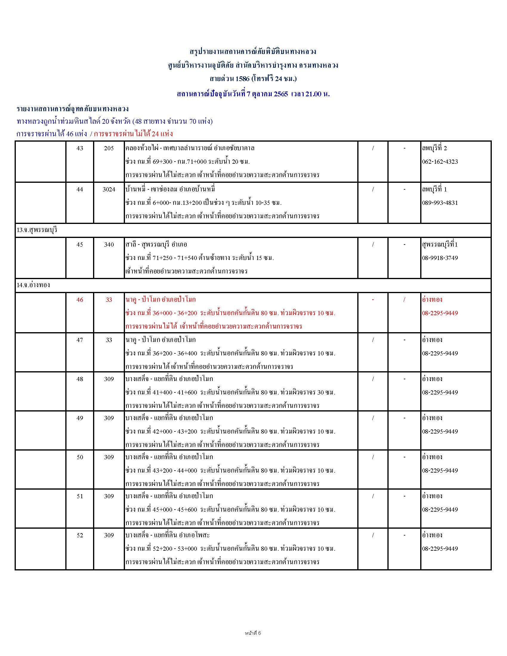 10.จ.มหาสารคาม ( 1 แห่ง) การจราจรผ่านไม่ได้ 1 แห่ง 11.จ.กรุงเทพมหานคร ( 1 แห่ง) การจราจรผ่านได้ 12.จ.ลพบุรี ( 5 แห่ง) การจราจรผ่านได้ 5 แห่ง 13.จ.สุพรรณบุรี ( 1 แห่ง) การจราจรผ่านได้ 1 แห่ง 14.จ.อ่างทอง (12 แห่ง) การจราจรผ่านได้ 9 แห่ง และการจราจรผ่านไม่ได้ 3 แห่ง 15.จ.พระนครศรีอยุธยา ( 2 แห่ง) การจราจรผ่านได้ทั้ง 2 แห่ง 16.จ.สิงห์บุรี ( 3 แห่ง) การจราจรผ่านได้ทั้ง 3 แห่ง 17.จ.เพชรบูรณ์ ( 1 แห่ง) การจราจรผ่านได้ 18.จ.ปราจีนบุรี ( 3 แห่ง) การจราจรผ่านได้ 2 แห่ง และการจราจรผ่านไม่ได้ 1 แห่ง 19.จ.เพชรบุรี ( 3 แห่ง) การจราจรผ่านได้ทั้ง 3 แห่ง และ 20.จ.ตรัง ( 1 แห่ง) การจราจรผ่านได้
