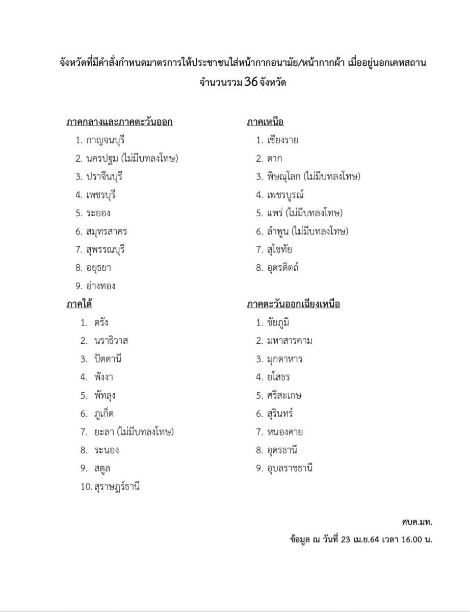 เมื่อวันที่ 23 เมษายน ผู้สื่อข่าวรายงานว่าศูนย์บริหารสถานการณ์โรคโควิด-19 กระทรวงมหาดไทย (ศบค.มท.) ได้รวบรวมจังหวัดที่มีคำสั่งกำหนดมาตรการให้ประชาชนใส่หน้ากากอนามัย/หน้ากากผ้า เมื่ออยู่นอกเคหสถาน หากฝ่าฝืนจะต้องโทษปรับเป็นเงินจำนวน 20,000 บาท ล่าสุดจำนวนรวม 36 จังหวัดทั่วประเทศ (ข้อมูล วันที่ 23 เม.ย. เวลา 16.00น.) ดังนี้ ภาคกลางและภาคตะวันออก 9 จังหวัด ได้แก่ 1.กาญจนบุรี 2 นครปฐม (ไม่มีบทลงโทษ) 3.ปราจีนบุรี 4.เพชรบุรี 5.ระยอง 6.สมุทรสาคร 7.สุพรรณบุรี 8.พระนครศรีอยุธยา และ 9.อ่างทอง