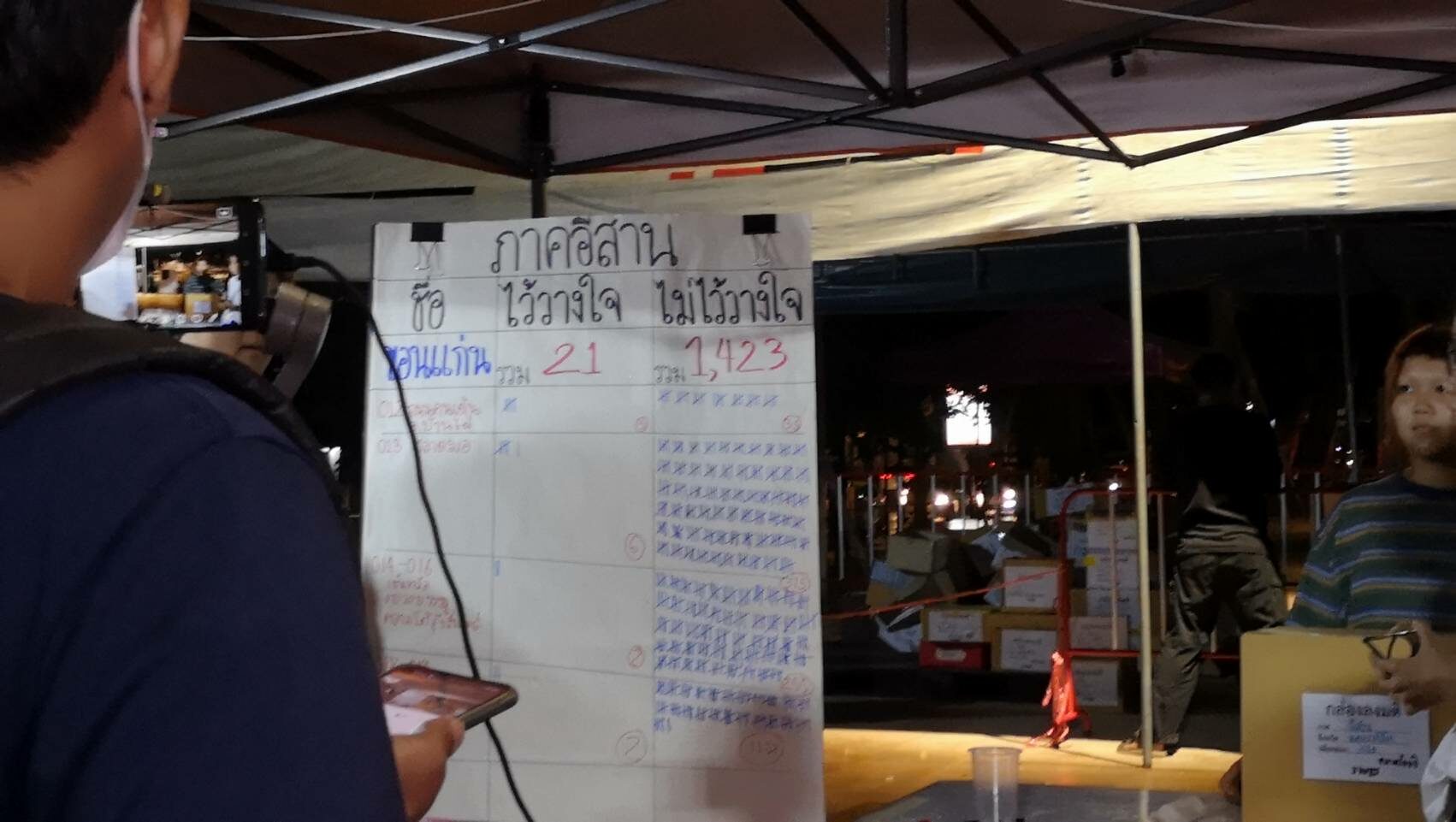 ขณะที่หน่วย กทม. อยู่ระหว่างนับคะแนน ที่หน่วยลงคะแนน ร้าน A book with no name มีผู้ไม่ไว้วางใจ 56 เสียง, เขตยานนาวา ไม่ไว้วางใจด้วย 60 เสียง โดยไม่มีผู้ไว้วางใจ ส่วนสยามสแควร์ลานบล๊อค 263 เสียงไม่ไว้วางใจ 263 เสียง ไว้วางใจ 1 เสียง ตามด้วยคะแนนหน้าตลาดต้นไทร หน้าสถานีรถไฟฟ้าแบริ่ง มีผู้ฝากข้อความ “ตู่ออกไป” ด้านภาคเหนือใกล้นับคะแนนแล้วเสร็จทั้งหมด