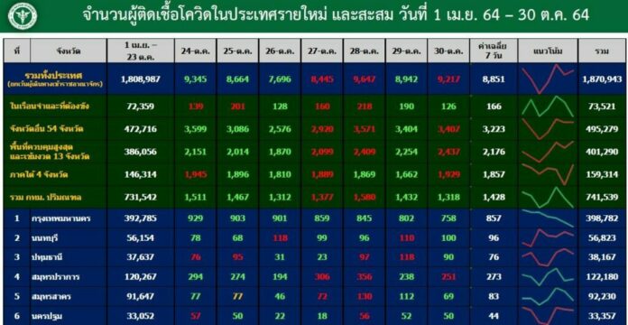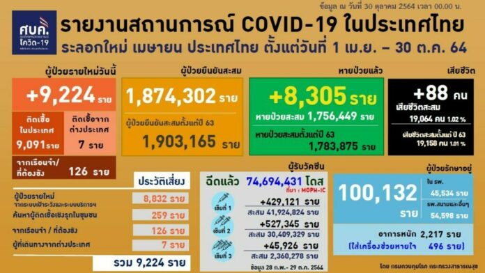 เมื่อวันที่ 30 ต.ค.64 ศูนย์บริหารสถานการณ์โควิด 19 (ศบค.) รายงานสถานการณ์โควิด 19 ประจำวันว่า วันนี้ประเทศไทยมีผู้ติดเชื้อใหม่ 9,224 ราย สะสม 1,903,165 ราย หายป่วย 8,305 ราย สะสม 1,783,875 ราย เสียชีวิต 88 ราย สะสม 19,158 ราย อยู่ระหว่างการรักษา 100,132 ราย อยู่ใน รพ. 45,534 ราย รพ.สนามและอื่นๆ 54,598 ราย มีอาการหนัก 2,217 ราย และใส่เครื่องช่วยหายใจ 496 ราย แนวโน้มผู้ป่วยอาการหนักและใส่เครื่องช่วยหายใจลดลงต่อเนื่อง