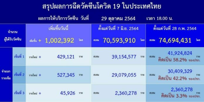 สำหรับการฉีดวัคซีนโควิด 19 วันที่ 29 ต.ค. ฉีดเพิ่มขึ้น 1,002,392 โดส สะสม 74,694,431 โดส แบ่งเป็นเข็มแรก 41,924,824 ราย คิดเป็น 58.2% ของประชากร เข็มสอง 30,409,329 ราย คิดเป็น 42.2% ของประชากร และเข็มสาม 2,360,278 ราย คิดเป็น 3.3% ของประชากร