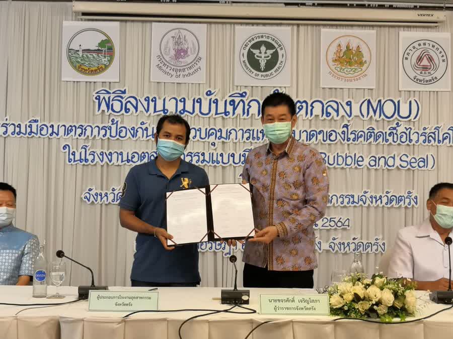 “ในวันนี้มีหน่วยงานภาคราชการและเอกชน ประกอบด้วย จังหวัดตรัง โดยผู้ว่าราชการจังหวัดตรัง นายแพทย์สาธารณสุขจังหวัดตรัง อุตสาหกรรมจังหวัดตรัง ประธานสภาอุตสาหกรรมจังหวัดตรัง ผู้อำนวยการโรงพยาบาลทีอาร์พีเอช และผู้ประกอบการโรงงานอุตสาหกรรม ได้ร่วมลงนามบันทึกข้อตกลง MOU ว่าด้วยความร่วมมือมาตรการป้องกันและควบคุมการแพร่ระบาดของโรคติดเชื้อไวรัสโคโรน่า 2019 ในโรงงานอุตสาหกรรมแบบมีส่วนร่วม Bubble and Seal